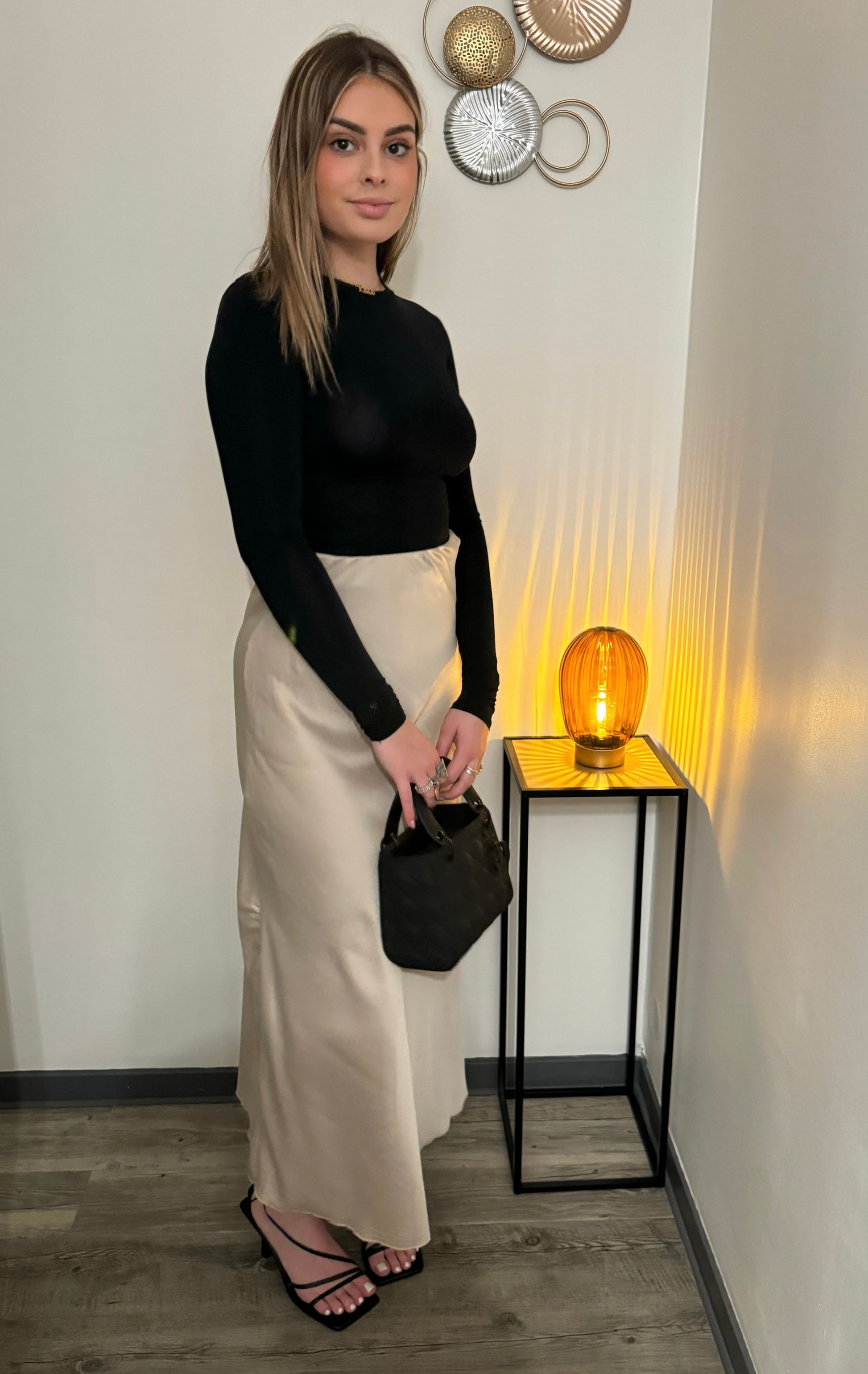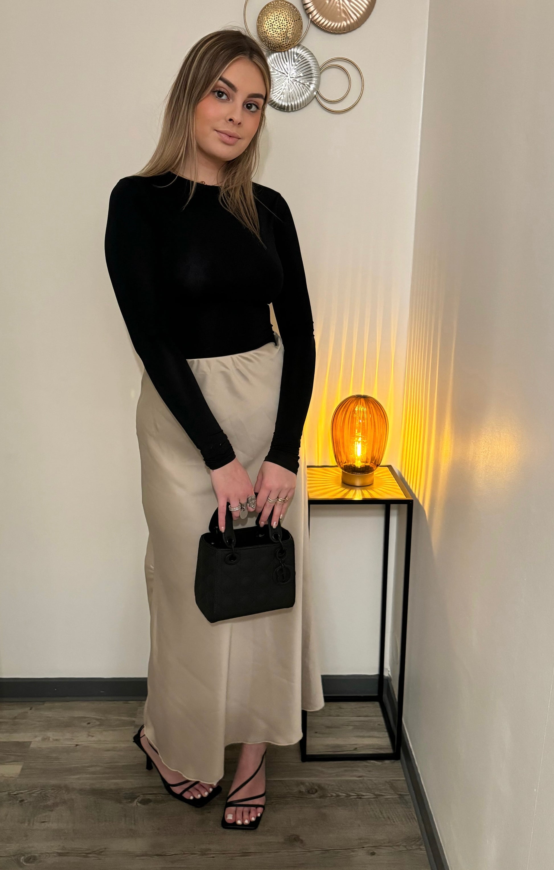 Cette jupe en satin luxueuse et fluide est un incontournable de la garde-robe. Sa brillance subtile ajoute une touche d'élégance à chaque mouvement, tandis que sa coupe flatteuse épouse les courbes pour une silhouette raffinée. Que vous l'associiez à un chemisier décontracté pour une journée de travail ou à un haut chic pour une soirée, cette jupe en satin promet un style irrésistible à chaque fois.